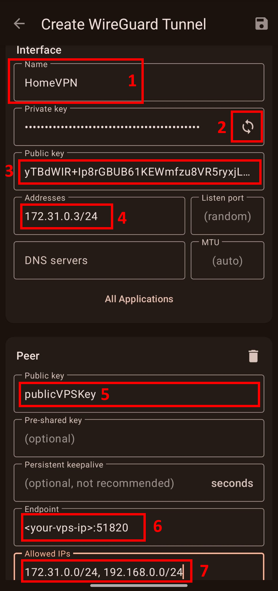 The phone needs its own key pair. The easiest way is to generate it directly in the WireGuard App.